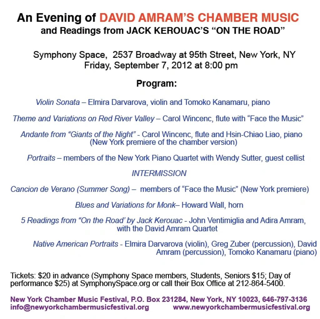 David Amram was co-commissioned by the New York Chamber Music Festival and members of the Amram Ensemble to compose a new work for the Amram Ensemble: THREE LOST LOVES for violin, saxophone and piano, based on stories by authors Willa Cather, Zora Neale Hurston and Jack Kerouac, world-premiered on October 3, 2016, at the ZKM Center for Art & Media in Karlsruhe, Germany, by the Amram Ensemble: Elmira Darvarova (violin), Kenneth Radnofsky (saxophone) and Thomas Weaver (piano). The works was also recorded for the CD "David Amram - SO IN AMERICA" (Affetto/Naxos).