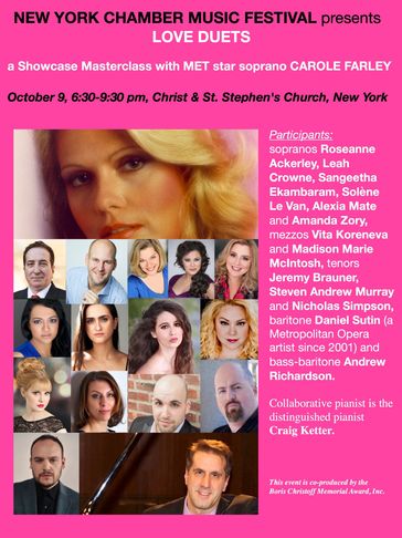 sopranos Roseanne Ackerley, Zhanna Alkhazova, Leah Crowne, Sangeetha Ekambaram, Alexia Mate, Solène Le Van and Amanda Zory, mezzos Vita Koreneva and Madison Marie McIntosh, tenors Jeremy Brauner, Steven Andrew Murray and Nicholas Simpson, baritone Daniel Sutin (a Metropolitan Opera artist since 2001) and bass-baritone Andrew Richardson.