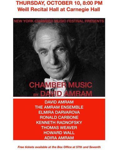 The New York Chamber Music Festival is thrilled to present the Free event "CHAMBER MUSIC by DAVID AMRAM" with the participation of DAVID AMRAM, the Amram Ensemble, Elmira Darvarova, Kenneth Radnofsky, Thomas Weaver, Adira Amram, Ronald Carbone, Howard Wall