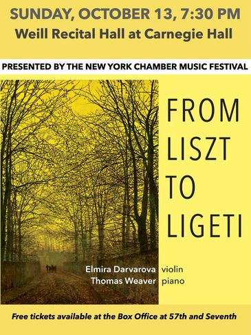 The New York Chamber Music Festival is thrilled to present the Free event “FROM LISZT TO LIGETI” - a Violin & Piano recital of music by the Hungarian composers Liszt, Hubay, Goldmark, Kodaly, Bartok and Ligeti, performed by violinist Elmira Darvarova (former Concertmaster of The Metropolitan Opera in New York) and pianist Thomas Weaver (faculty member, The Curtis Institute).